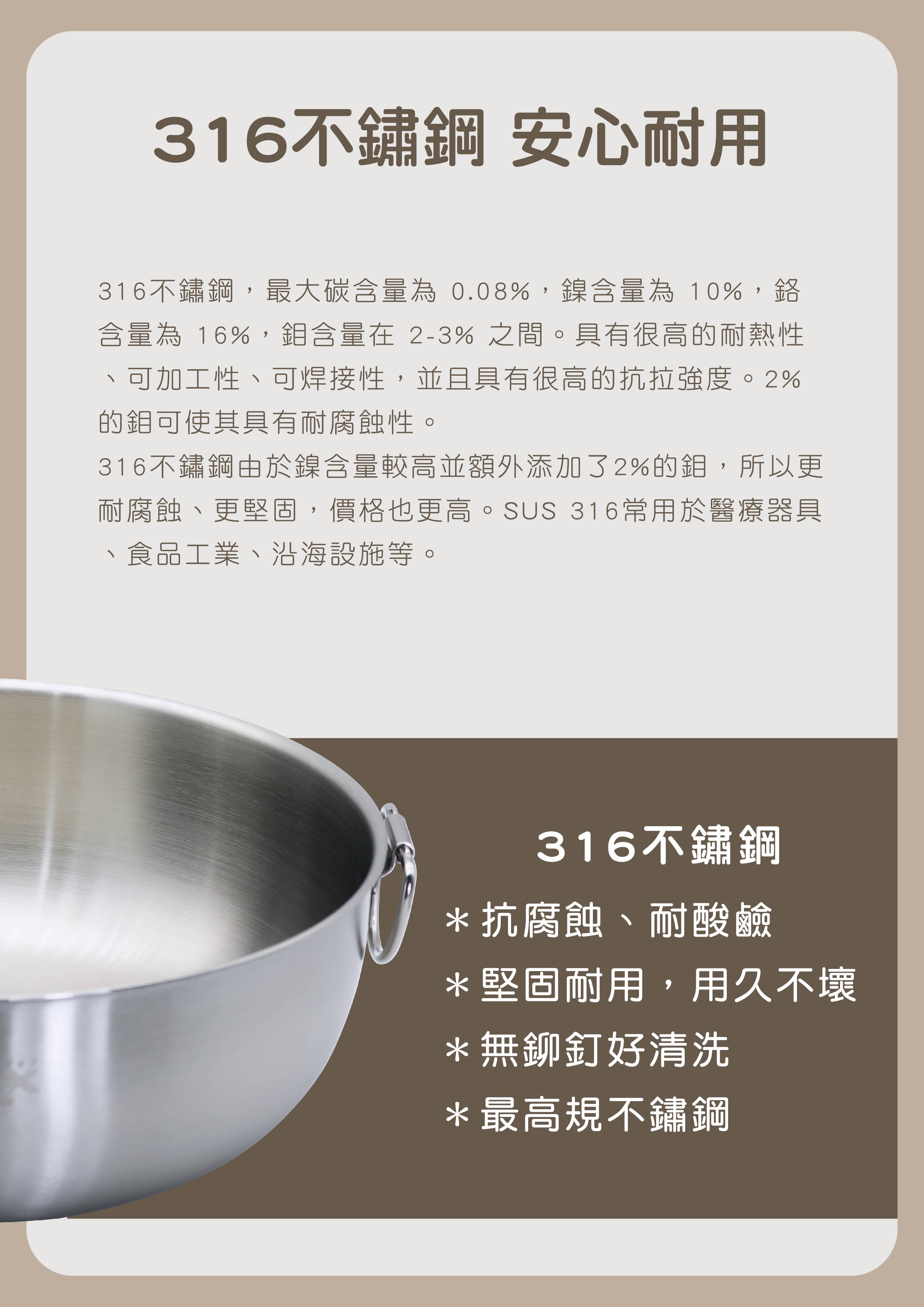 品名:LINOX316七層導磁萬用鍋 材質:主體:316複合金不鏽鋼 / 蓋子:玻璃 尺寸:口徑30cmx 31cmx 10.5cm(不含蓋) 重量:2230g 容量:約5.5L 產地:中國(韓國監製)