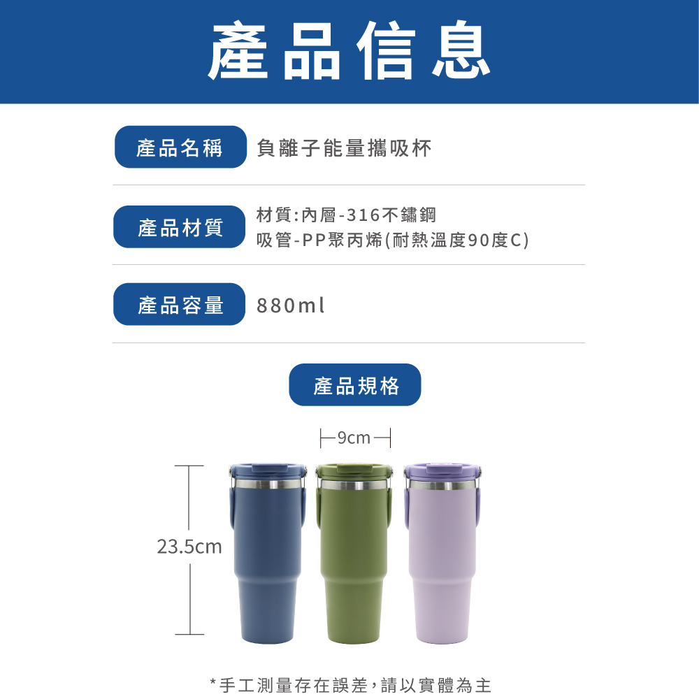 商品規格 品名:負離子能量攜吸杯 尺寸:直徑9cmX23.5cm 容量:880ml 重量:400g 材質:內層-316不鏽鋼 吸管-PP聚丙烯(耐熱溫度90度C) 產地:中國(日本監製) 顏色:藍、紫、綠 【注意事項】 使用前請先用清潔劑清洗。 清洗時請使用柔軟的海綿及中性洗潔劑清洗。 請勿與堅硬物體碰撞或重摔於堅硬表面上。 請至於孩童拿取不到的地方,並避免孩童單獨使用。