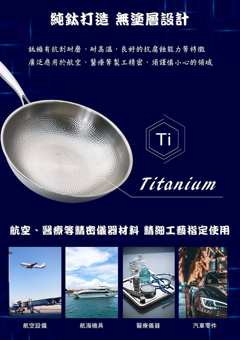 材質:鍋內:純鈦板/鍋中:多層鋁合金/鍋底:不鏽鋼/手柄:不鏽鋼
