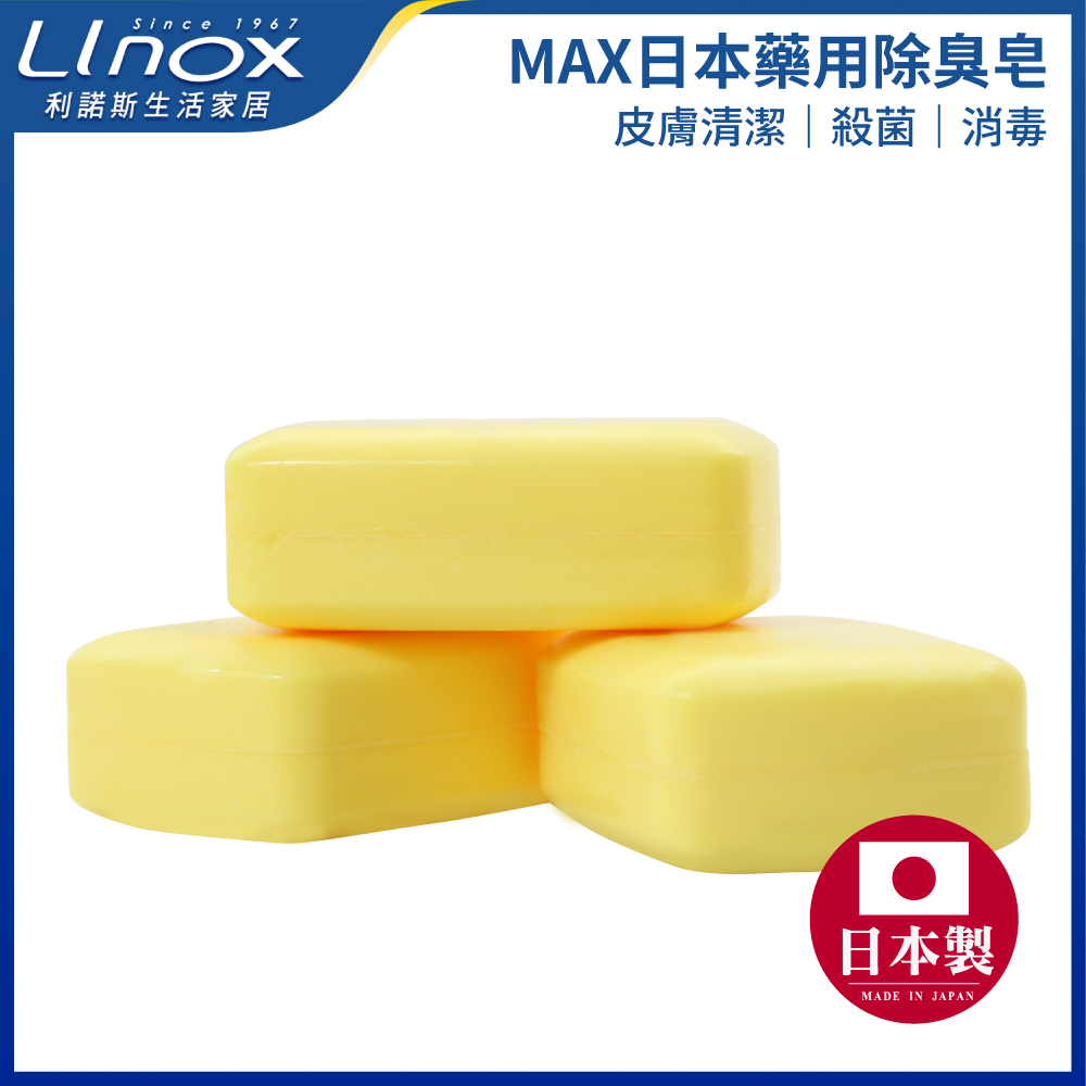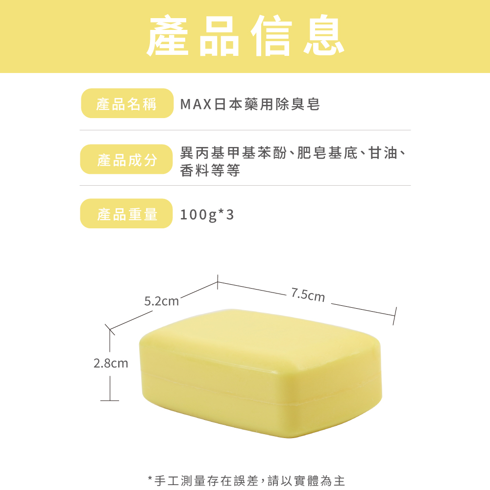商品規格 品名:MAX日本藥用除臭皂 三入 型號: JA-MAX-YES2 數量:三入 重量:100g x3 用途:潔淨全身肌膚用 使用方法:適量潔淨全身肌膚後,再以水充份洗淨即可。 保存方法:請置於陰涼處,避免高溫日光直射。 產地:日本