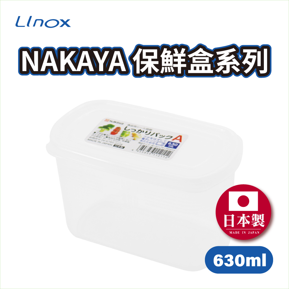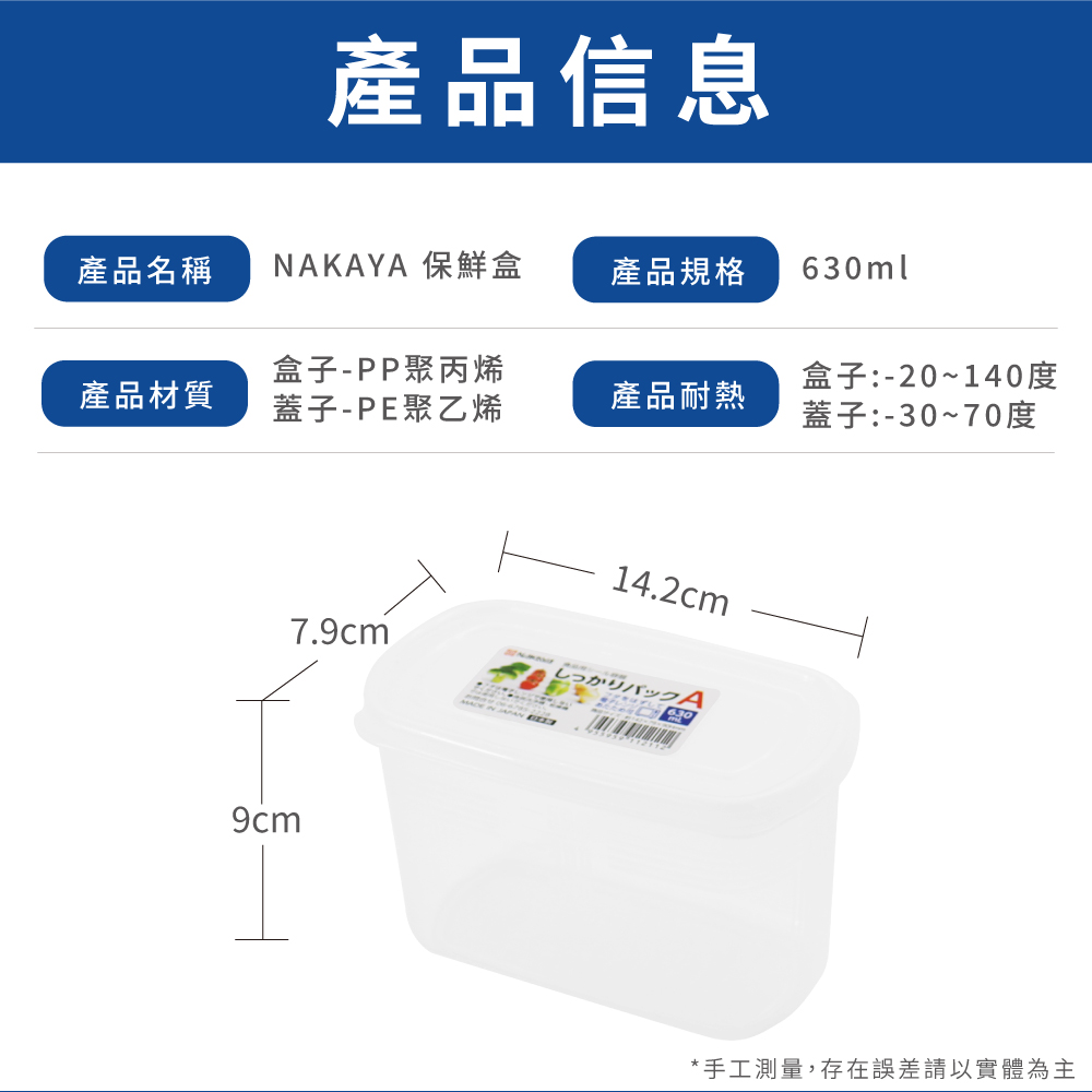 商品規格 品名: NAKAYA保鮮盒 630ml 型號: JA-NKY-K121 數量: 乙入 尺寸: 14.2cm X 7.9cm X 9cm 重量: 68g 材質: 盒子-PP聚丙烯 蓋子:PE聚乙烯 耐熱溫度: -20~140度 蓋子:-30~70度 產地: 日本