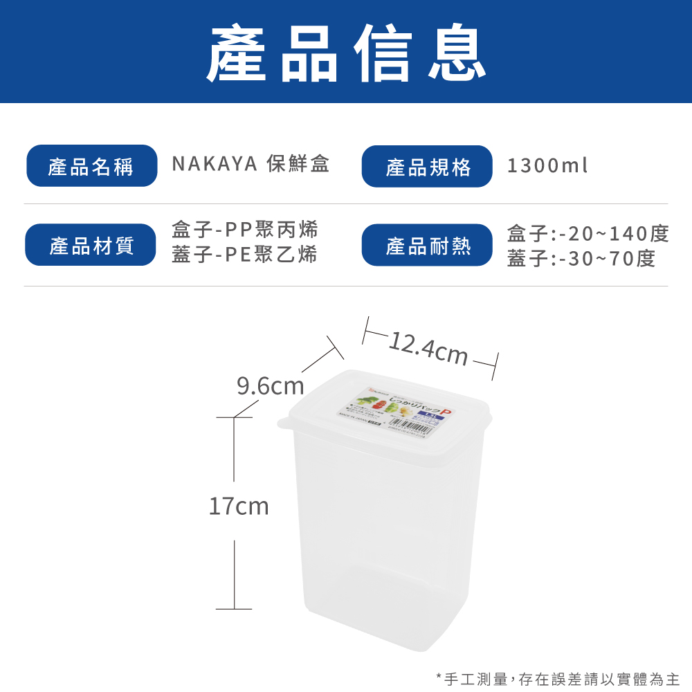 商品規格 品名: NAKAYA保鮮盒(高) 1.3L 型號: JA-NKY-K200 數量: 乙入 尺寸: 12.4cm X9.6cm X 17cm 重量: 117g 材質: 盒子-PP聚丙烯 蓋子:PE聚乙烯 耐熱溫度: -20~140度 蓋子:-30~70度 產地: 日本
