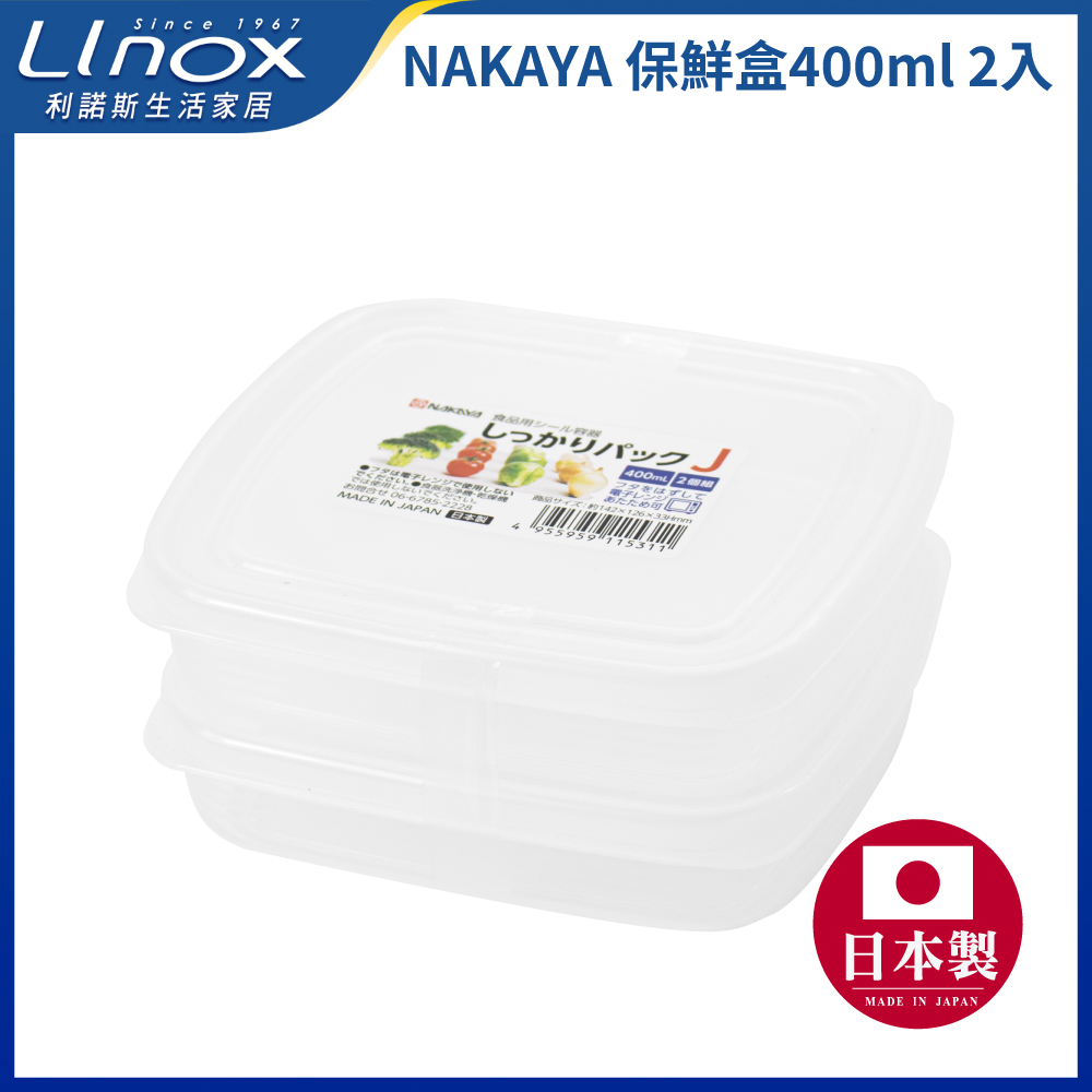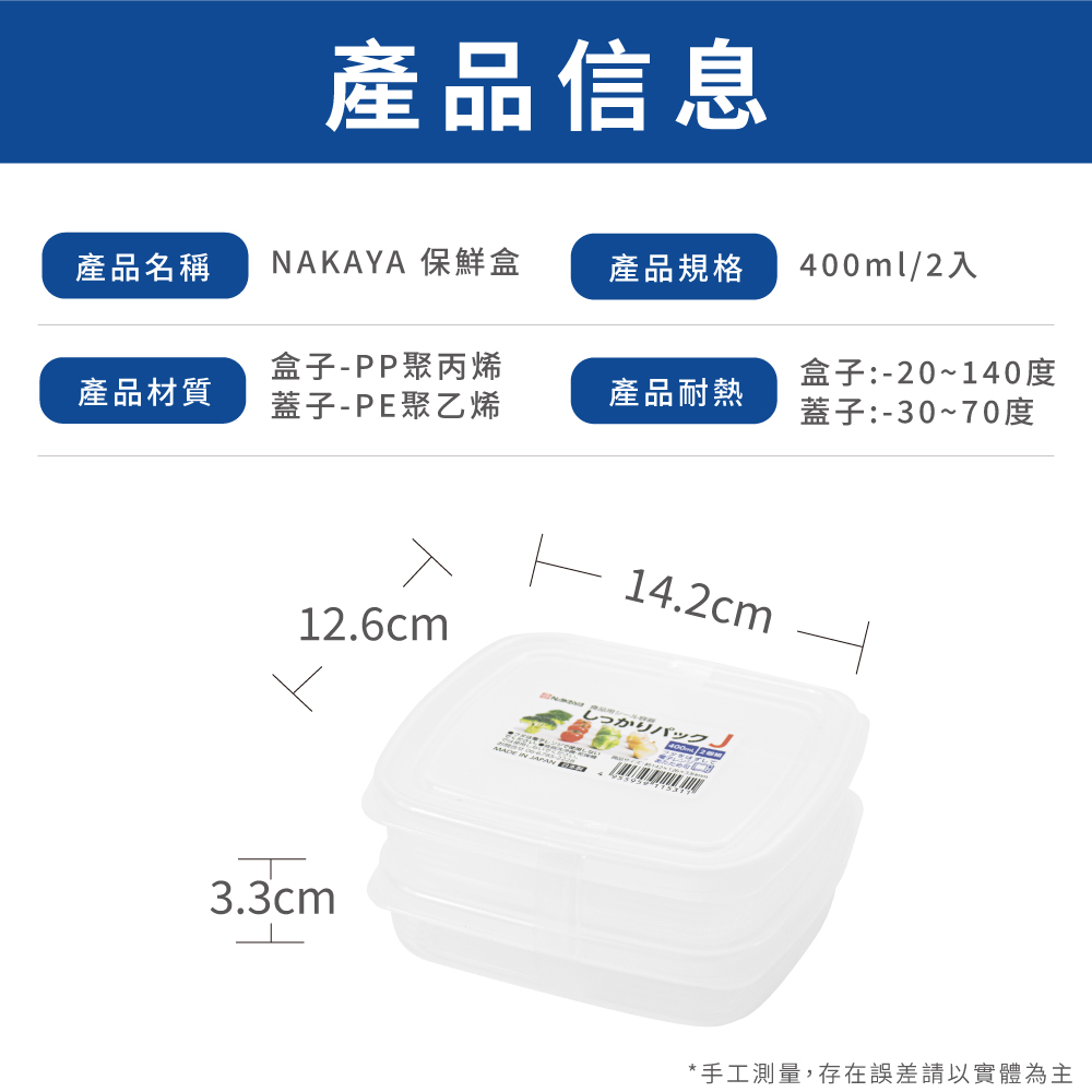 商品規格 品名: NAKAYA二入保鮮盒(白) 400ml 型號: JA-NKY-K153 數量: 二入 尺寸: 14.2cm X12.6cm X 3.3cm (單個) 重量: 127g (二入) 材質: 盒子-PP聚丙烯 蓋子:PE聚乙烯 耐熱溫度: -20~140度 蓋子:-30~70度 產地: 日本