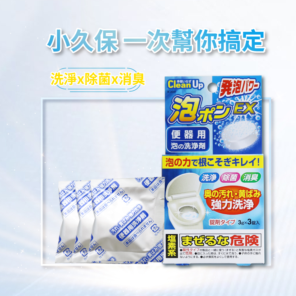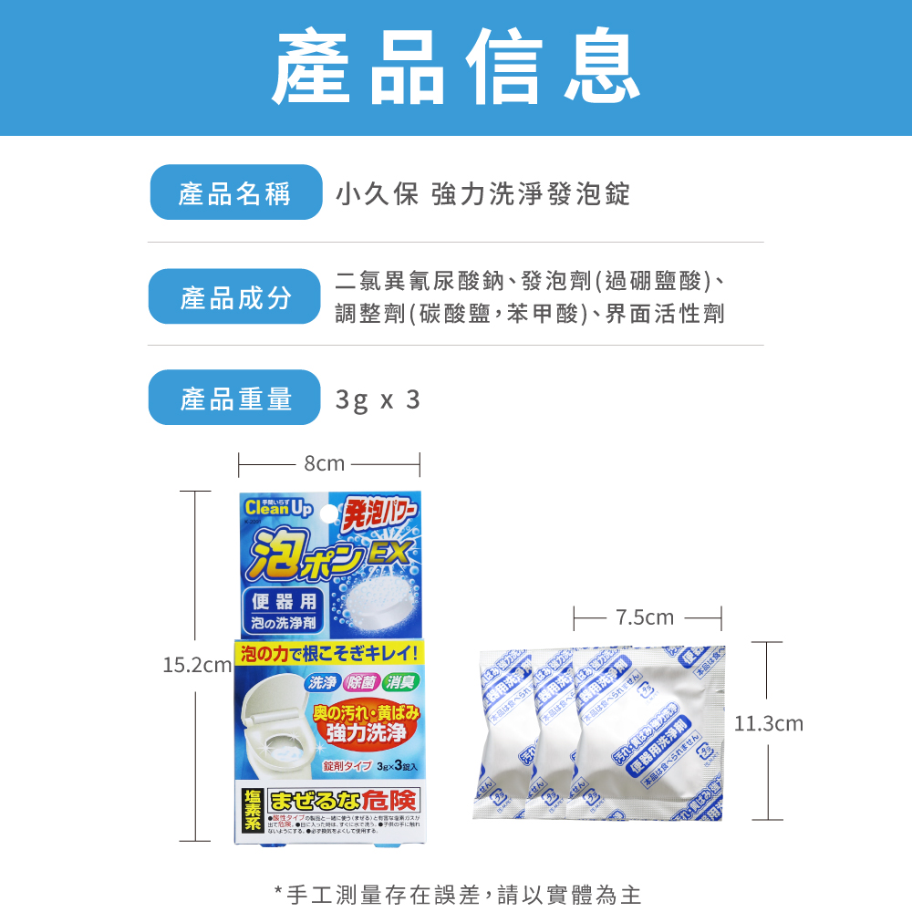 商品規格 品名: 小久保 強力洗淨發泡錠 型號: JA-KKB-920917 重量: 3g X 3g 錠 成分: 二氯異氰尿酸鈉、發泡劑(過硼鹽酸)、調整劑(碳酸鹽,苯甲酸)、界面活性劑 產地: 日本 用途:馬桶的洗淨、除菌、消臭。 使用方法: 馬桶內請丟入一錠本產品,放置約30分鐘後沖水